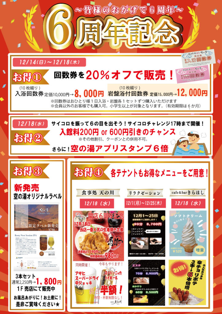 当日は「6」にこだわった超お得イベントを数多く行いますので、ぜひ今年の疲れを落としに空の湯にお越しくださいませ♨