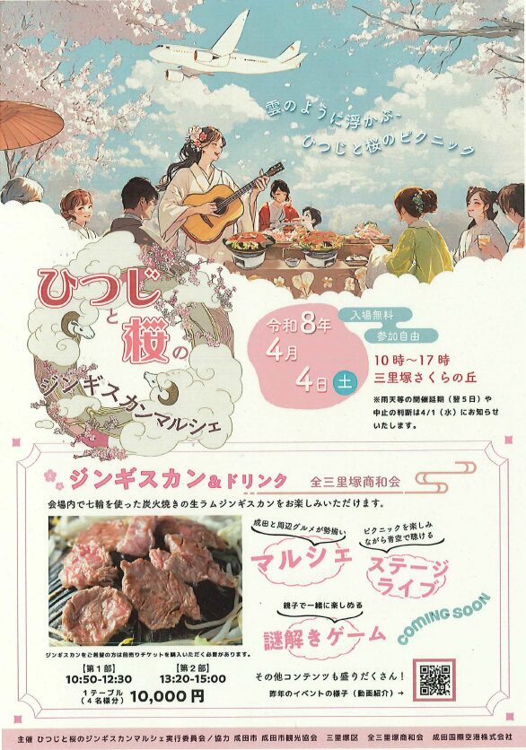 4月4日(土)10時~17時、空の湯から車で7分・自転車で20分ほどの三里塚さくらの丘にて「ひつじと桜のジンギスカンマルシェ」が開催されます。
